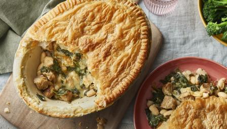 Place the pie on a baking tray and bake for about 20–25 minutes until the pie top is golden and flaky. Leave to stand for a couple of minutes then serve with the Tenderstem broccoli on the side.