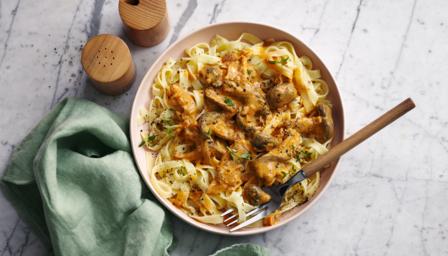 This vegan mushroom stroganoff is served with a flat ribbon pasta, such as pappardelle or fettuccine. It’s rich and full of flavour and quick to cook – ideal for a midweek supper.