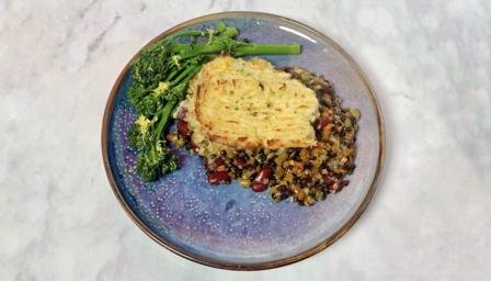 Vegan shepherd’s pie with lemon and garlic Tenderstem broccoli
