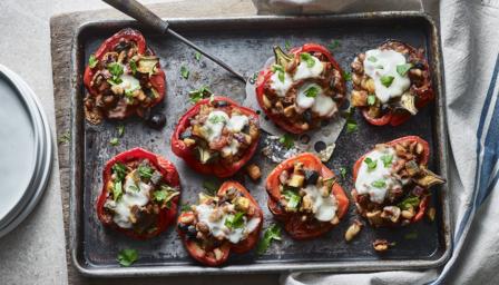 Spoon the vegetable mixture into the roasted peppers, filling them generously. Sprinkle with mozzarella. Put the peppers back in the oven for 3–5 minutes, until the cheese starts to brown and melt.