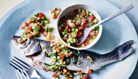 Whole sea bass with warmed tomato and citrus salsa