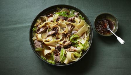Using a slotted spoon, lift out the hot lamb and share between the two bowls, then ladle the broth on top. Add 1 teaspoon of crispy chilli oil to each bowl and take both bowls to the table, making sure you come back for the chilli oil so you can add more as you eat.