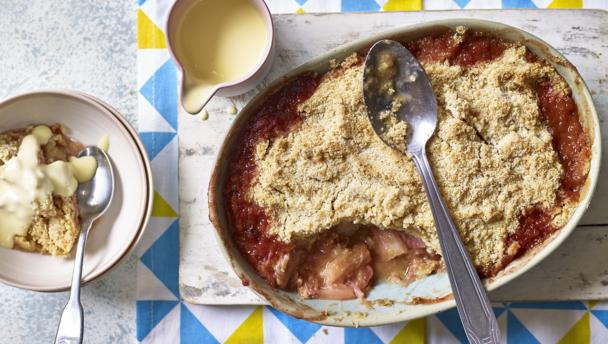 All you need to make a crumble topping is flour, sugar and butter. Rub cold cubes of butter into the flour using your finger tips until the mixture resembles breadcrumbs. You can stir ingredients such as oats and flaked almonds into the mixture to add some texture, if you like. Sprinkle ontop of your chosen fruits and bake as directed, using a recipe.