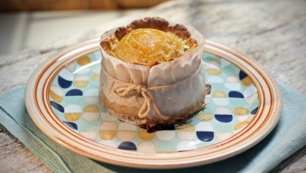 To make an individual hand-raised pie, wrap the outside of a jam jar with cling-film.