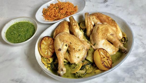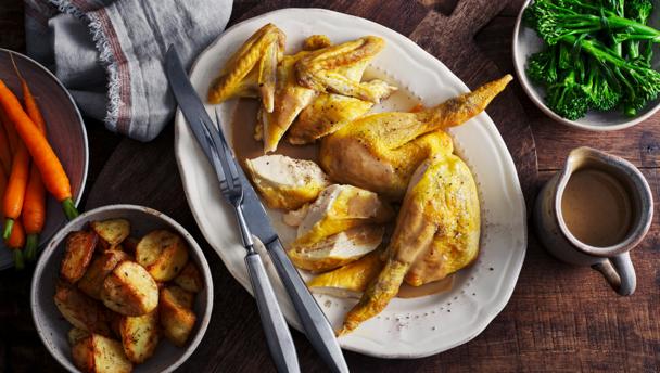 -Place the bird, skin-side up, onto the chopping board. Break the breast bone by pressing it with your hand (this will flatten the bird so that it cooks more easily).