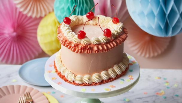 Mary Berry demonstrates how a cake is ready when it's golden-brown and coming away from the edge of the tin.