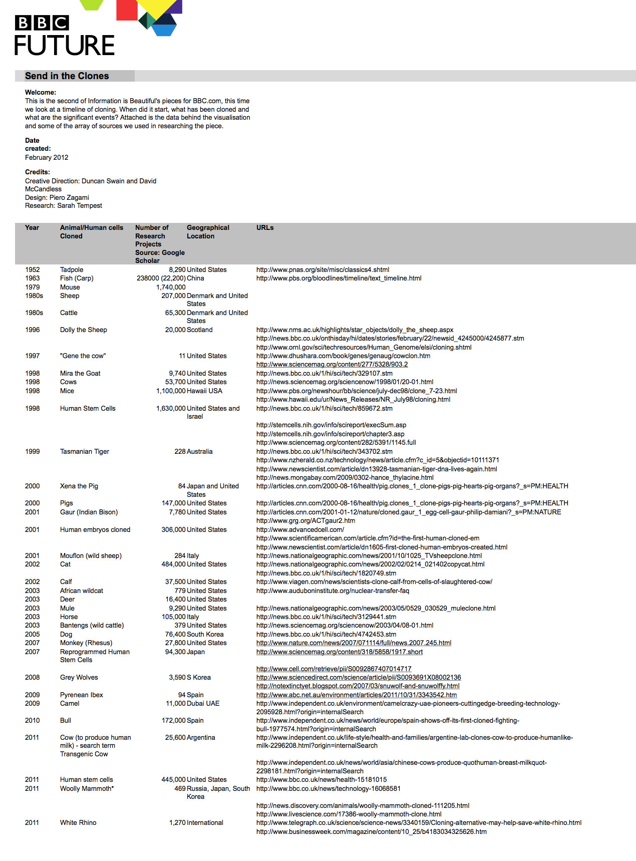 Bubbles around each animal correspond to the “buzz” that each cloning milestone has had on the field. To gauge the level of buzz, we turned to Google Scholar, which indexes the world's scientific literature across a whole range of disciplines. The data for each bubble came from tracking citations of different combinations of relevant terms (e.g. “cloning” and “human stem cells”).