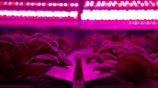 Instead of growing crops in sunny fields or greenhouses, some companies stack them and grow them in old, dark warehouses with UV lights — saving water and harvesting produce faster.
