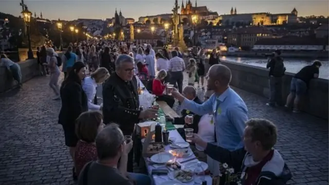 Abantu baharurwa mu bihumbi bakoraniye ku meza ipima uburebure bwa metero 500 ku kiraro Charles Bridge kiri ku mugwa mukuru Prague ku wa kabiri banywa bongera bafungura ivyo baje bitekereye.