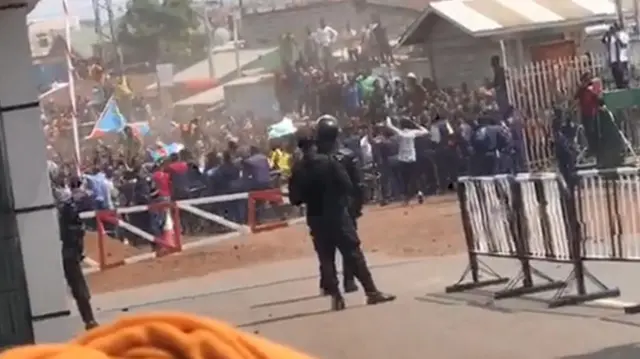 Abashinzwe umupaka ku ruhande rwa DR Congo baboneka bagerageza gusubiza inyuma abigaragambya basaga n’abashaka kwinjira mu Rwanda ku ngufu.