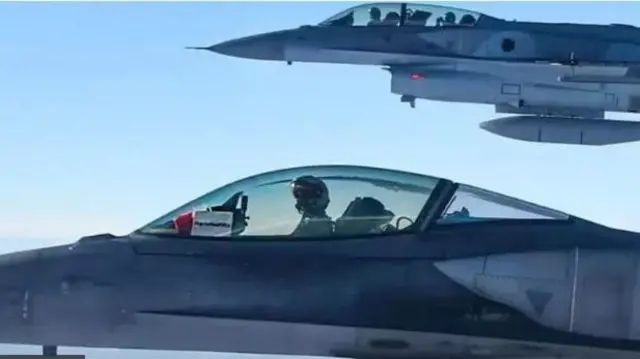Amafoto na yo nyene yerekanywe umwe mu baderevaa w'indege ya F-16 afise ikimenyetso c'umugwi w'igihugu ca Pologne kw'idirisha.