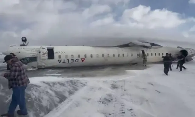 Ingenzi n'abakozi bose bari mu ndege yakorotse ikagwa igaramye mu gihe yariko irururuka ku kibuga c'indege ca Toronto Pearson muri Canada, bararokotse, nk'uko umuyobozi mukuru w'ico kibuga c'indege abivuga.