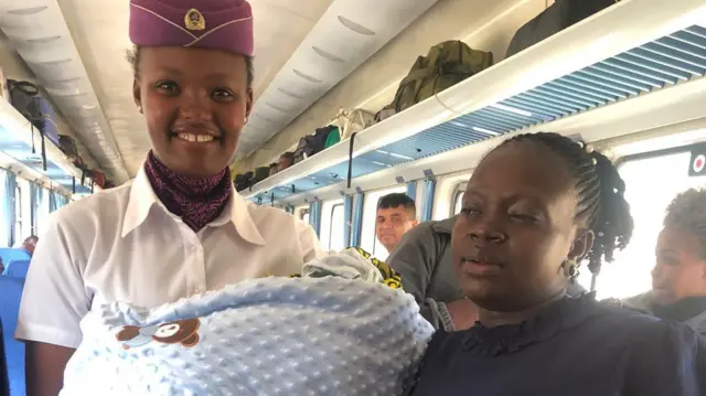 Ikigo gishinzwe ingendo za gariyamoshi cyavuze ko mu bagenzi hahise habonekamo umuganga witwa Dr Indanyenyi Luseso, maze we n’umukozi ufasha abagenzi muri gariyamoshi bafasha uyu mugore kwibaruka neza.