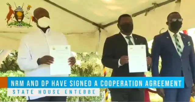 Aya masezerano hagati y’umugambwe uri ku butegetsi National Resistance Movement hamwe n’umugambwe Democratic Party yateweko igikumu nijoro ku wa gatatu inyuma y’umubonano hagati y’aba bategetsi babiri mu biro vy’umukuru w’igihugu, State House, i Entebbe.