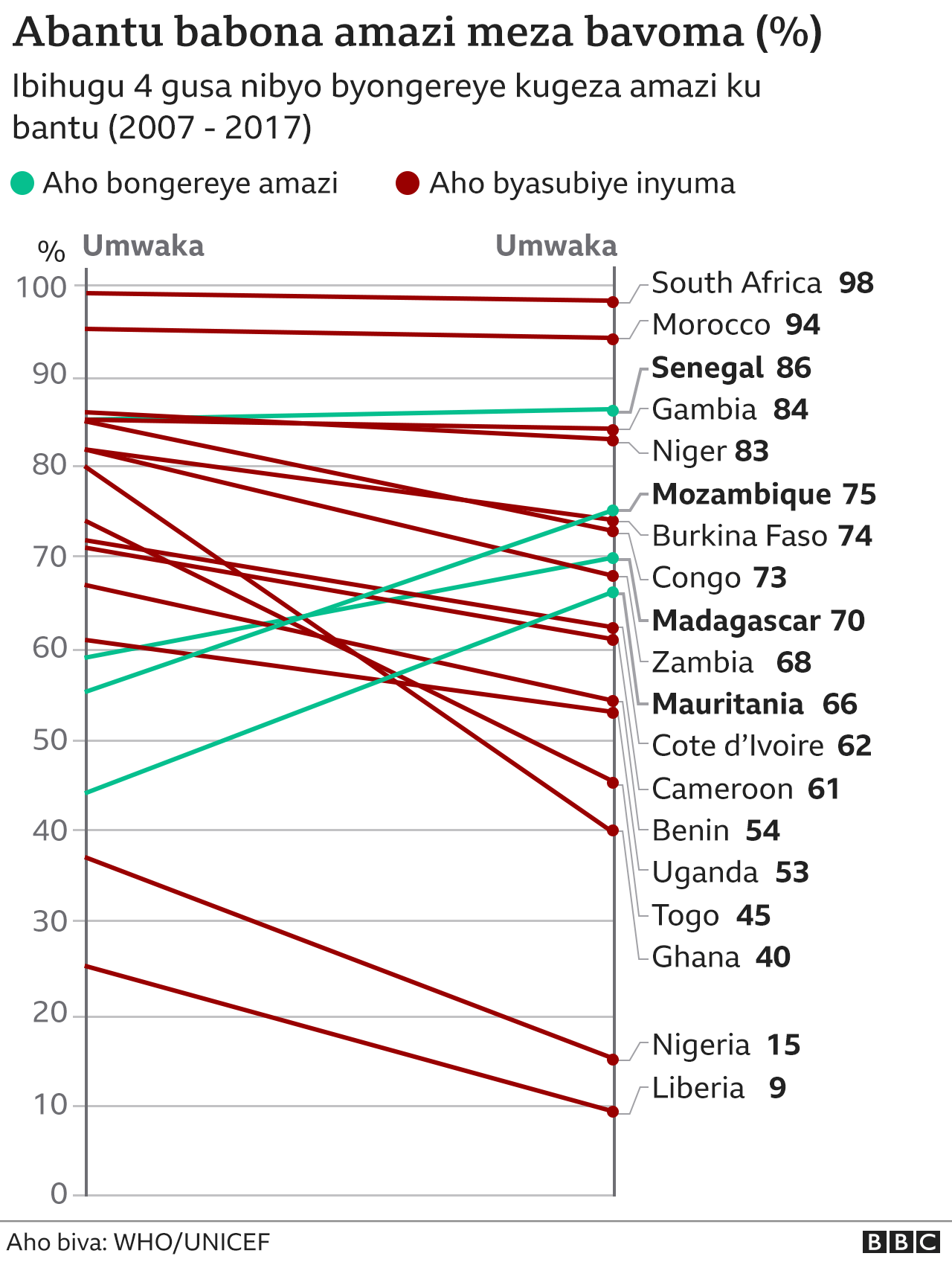 Haboneka amazi acunzwe neza, adahanze kandi arinzwe kwandura. Urugero rw'abatuye Africa bagera ku mazi nk'ayo ruva ku 9% muri Liberia kugera kuri 99% muri Africa y'Epfo, nk'uko bivugwa na WHO n'ishami rya ONU ryita ku bana UNICEF.