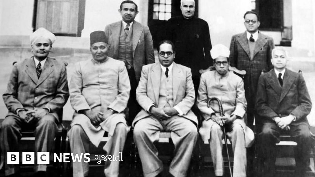 ઇમેજ કૅપ્શન, બંધારણની મુસદ્દા સમિતિના સભ્યો સાથે બેઠેલા (વચ્ચે) ડૉ. આંબેડકર (ઑગસ્ટ 1947)