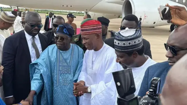 Gwamnan Abba Yusuf ne ya tarbi shugaba Tinubu a filin jirgin sama na Malam Aminu Kano tare da sauran magoya bayan jam'iyyar APC, waɗanda suka yi ta sowa da rera waƙoƙi.