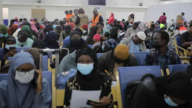 Zainab Abdulqadir, wadda ke riƙe da jakkarta ta hannu, ta shaida wa BBC cewa ta shiga hali na tashin hankali a tsawon lokacin da ta kwashe tana son baro ƙasar ta Sudan.