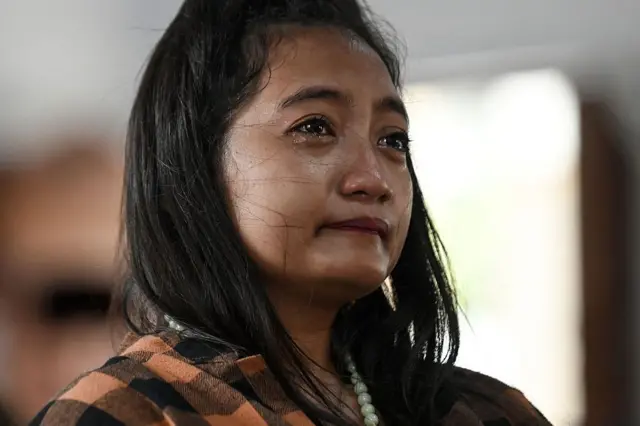 Bayanan hoto, Wata mata na zubar da hawaye yayin da mabiya ɗariƙar Katolika ke taruwa a cocin Redeemer Church da ke birnin Bangkok na ƙasar Thailand a yau Litinin bayan samun labarin rasuwar Fafaroma Francis