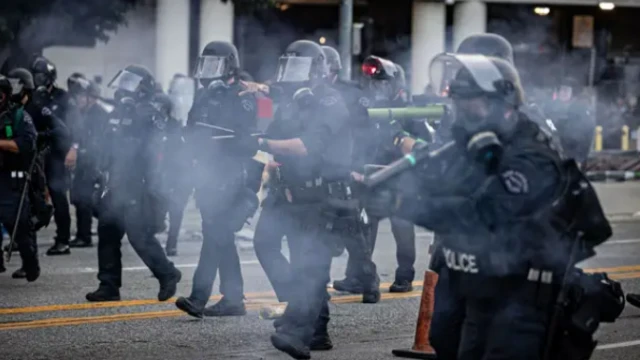 Har yanzu yankin da aka fara zanga-zangar na murtuke da hayaki mai sa hawaye – in da jami'an kamen ke kokarin kawar da masu tarzomar.