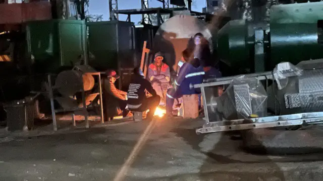 Mazan sanye suke da riga mai hade da wando, sun kunna wutar itace, ga kuma hasken farin wuta a sararin samaniya, zaman dakon dawo da wutar lantarki su ke yi domin samun damar yin aiki na 'yan sa'o'i kalilan kafin a sake dauke ta.