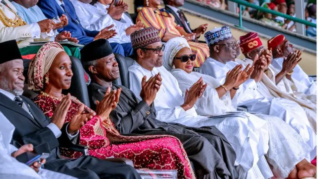 Shugaba Muhammadu Buhari da matarsa Aisha Buhari da Mataimakin Shugaban Farfesa Yemi Osinbajo da matarsa Dolapo Osinbajo da sabon Shugaban majalisar dattawa Sanata Ahmad Lawan da sauran manyan baki a wajen bikin.