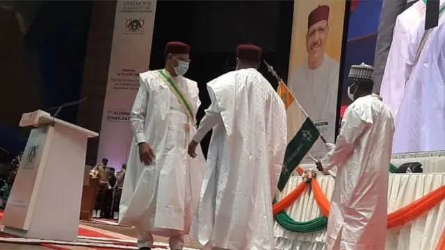 Shugaba mai barin gado Issoufou Mahamadou ya mika wa sabon shugaban kasar tutar Jamhuriyar Nijar da ke nuna sauya mulki daga hannusa zuwa hannun Mohamed Bazoum.