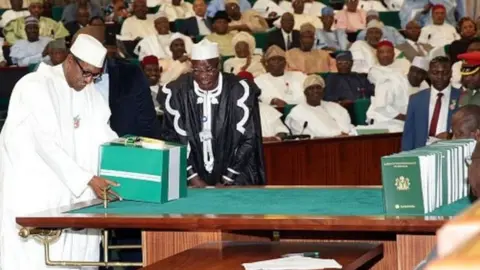 Bayanan hoto, Buhari a majalisar zartarwa lokacin sanya hannu kan daftarin kasafi ranar Litinin Kasafin kudin Najeriya
