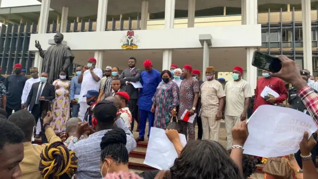 An nuna hoton bidiyon shugaban Majalisar dokokin jihar ta Enugu yana yi wa masu zanga-zanga a harabar majalisar jawabi.