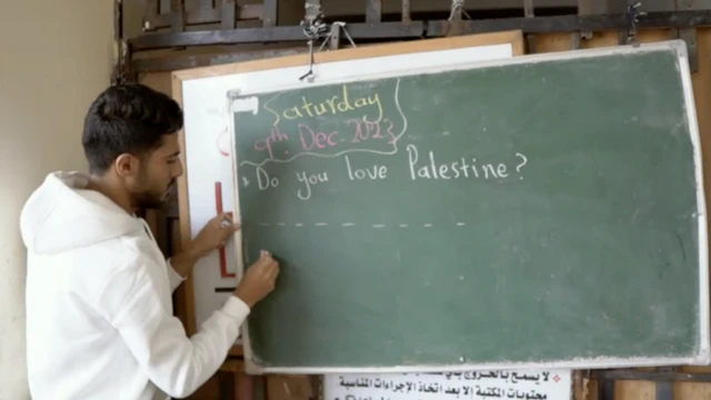 कमरे में दर्जन भर कुर्सियों के सामने लकड़ी का एक बोर्ड रखा हुआ है जिसमें अंग्रेज़ी में लिखा है, ‘क्या आपको फ़लस्तीन से मोहब्बत है?’