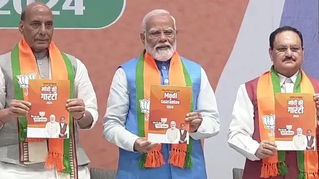 भारतीय जनता पार्टी (बीजेपी) ने 2024 लोकसभा चुनाव के लिए रविवार को दिल्ली के अपने पार्टी मुख्यालय में घोषणापत्र जारी कर दिया. पार्टी ने घोषणापत्र को 'भाजपा का संकल्प, मोदी की गारंटी' नाम दिया है.
