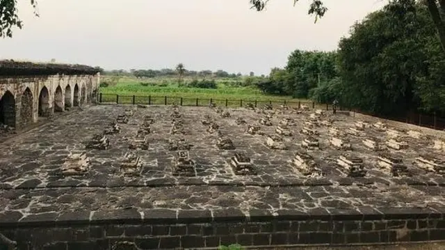 कर्नाटक के बीजापुर में एक चबूतरे पर कब्रों की सात कतारें हैं.