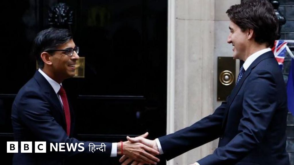 ब्रितानी प्रधानमंत्री ऋषि सुनक से हाथ मिलाते कनाडा के प्रधानमंत्री जस्टिन ट्रूडो