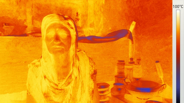 दोपहर में वह थर्मल कैमरे में गहरे लाल रंग और चमकीले पीले रंग में दिखती हैं. उनके आसपास के तापमान को कैमरे में 53 डिग्री सेल्सियस दर्ज किया गया. वह पसीने से भीगे अपने चेहरे को पोंछती हैं, जबकि उनका कुर्ता पसीने से तरबतर है.