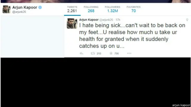 अर्जुन ने ट्वीट किया, "मुझे बीमार होने से नफ़रत है, बेसब्री से इंतज़ार है वापिस अपने पैरों पर खड़े होने का...आपको तब अपनी सेहत का ख़्याल आता है जब ये ख़राब हो जाती है."