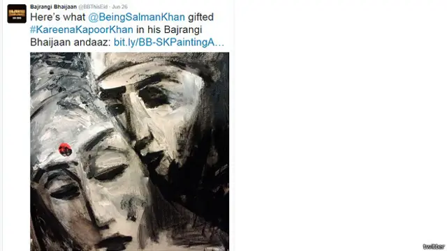 'बजरंगी भाईजान' फ़िल्म के किरदारों को ध्यान में रखकर बनाई हुई पेन्टिंग सलमान ने ट्वीट की थी. उन्होंने यही पेंटिंग करीना को गिफ़्ट की है.