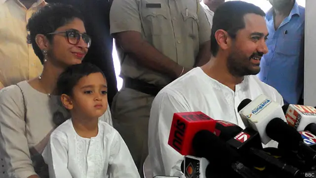 ईद के मौके पर अभिनेता आमिर ख़ान अपनी पत्नी किरण राव और अपने छोटे बेटे आज़ाद के साथ पहली बार मीडिया से मुख़ातिब हुए.