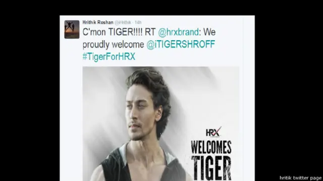ऋतिक ने बुधवार रात ट्वीट कर ये जानकारी दी की टाइगर श्रॉफ़ उनकी क्लोदिंग ब्रांड 'एच आर ऐक्स' के एंबैसडर बनेंगे, ऋतिक ने ट्वीट कर कहा "टाइगर आपका 'एच आर ऐक्स' में स्वागत है हमें गर्व है कि आप हमारे साथ जुड़े."