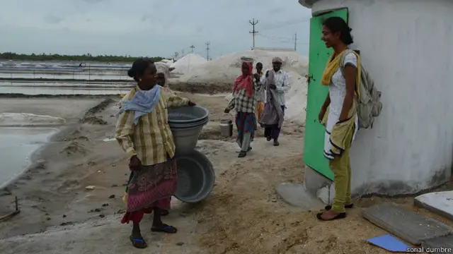 नमक की मज़दूरी करने वाली शकुंतला का कहना है,"यहाँ पर कई मर्द भी काम करते है. मर्द 3 किलोमीटर चलकर खुले में पेशाब कर लेते हैं लेकिन हम औरतों के लिए खुले में पेशाब करना मुश्किल हैं."