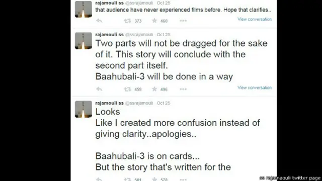 राजामौली ने ट्विटर पर जानकारी दी, " बाहुबली 3 को लेकर योजना बन चुकी है, लेकिन फिल्म के पहले दो भाग के लिए लिखी गई कहानी को तीसरे भाग के लिए आगे नहीं खींचा जाएगा.यह कहानी दूसरे भाग के साथ ही समाप्त हो जाएगी."