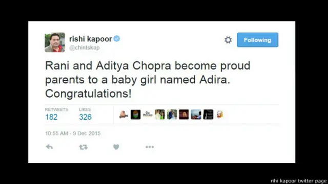 ऋषि कपूर ने अपने ट्वीट में कहा, "रानी और आदित्य को माता-पिता बनने पर बधाई. उनकी बेटी का नाम अदिरा रखा गया है."