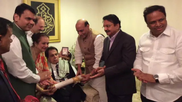 राजनाथ सिंह ने ट्विटर पर दिलीप कुमार को सम्मानित करते हुए अपनी तस्वीर साझा की है. इसमें राजनाथ सिंह के अलावा महाराष्ट्र के मुख्यमंत्री देवेंद्र फडनवीस को देखा जा सकता है.