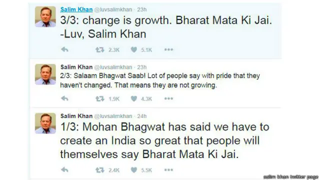 शोले' और 'ज़ंजीर' सरीखी फ़िल्मों की पटकथा लिखने वाले सलीम खान ने शुरुआत में ही आरएसएस प्रमुख मोहन भागवत के बारे में एक के बाद एक तीन ट्वीट किए.
