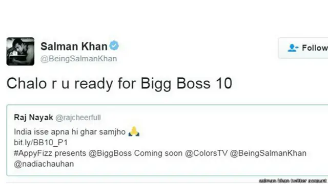 वहीं इस ट्वीट को अभिनेता सलमान ने रिट्वीट करते हुए लिखा, ''चलो... तो क्या आप तैयार हैं बिग बॉस 10 के लिए.''