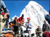 एक ब्रितानी संगीत मंडली ने दुनिया में सबसे अधिक ऊँचाई पर संगीत कार्यक्रम आयोजित करने का विश्व रिकॉर्ड बनाने का दावा किया है. हिमालय के ऊपर माउंट एवरेस्ट के आधार शिविर से भी ऊपर 'हिडेन' नाम की संगीत मंडली ने 40 मिनट का कार्यक्रम पेश किया जिसका आनंद लगभग 100 पर्वतारोहियों ने उठाया. समुद्र की सतह से साढ़े पाँच हज़ार मीटर की ऊँचाई पर आयोजित संगीत समारोह का उद्देश्य नेपाल में जारी माओवादी हिंसा से प्रभावित बच्चों के लिए आर्थिक सहायता जुटाना था. संगीतकार ओज़े बेल्डन ने बताया कि यह एक अदभुत अनुभव था. इसी बैंड के नाम सबसे लंबा कॉन्सर्ट पेश करने का भी रिकॉर्ड है, उन्होंने लंदन में लगातार 44 घंटे तक लोगों का मनोरंजन किया था. नेपाल बालवाटिका नाम की एक कल्याणकारी संस्था ने हिमालय की ऊँचाइयों पर संगीत कार्यक्रम का आयोजन किया था. इस संगीत समारोह से बच्चों के लिए 37 लाख नेपाली रूपए एकत्र किए गए. बेल्डन ने कहा नेपाल के धुलीखेल ज़िले में बच्चों के लिए एक आश्रय का प्रबंध किया जाएगा जहाँ उन्हें रोज़गारोन्मुख शिक्षा भी दी जाएगी. कल्याणकारी संस्था का कहना है कि पिछले नौ वर्षों से जारी माओवादी संघर्ष में हज़ारों बच्चे अनाथ हो गए हैं. माओवादी संगठनों और सरकारी सेना के बीच जारी संघर्ष में अब तक 11 हज़ार से अधिक लोगों की मौत हो चुकी है. | इससे जुड़ी ख़बरें नेपाली समलैंगिकों को एल्टन जॉन की मदद05 अक्तूबर, 2005 | भारत और पड़ोस क्या एवरेस्ट की ऊँचाई घट रही है?25 जनवरी, 2005 | भारत और पड़ोस विकास के लिए नेपाल को सहायता03 अगस्त, 2005 | भारत और पड़ोस 'नेपाल में मानवीय संकट की स्थिति'18 मार्च, 2005 | भारत और पड़ोस हिमालय को बचाने की गुहार17 नवंबर, 2004 | भारत और पड़ोस | |||||||||||||||||||||||||||||||||||||||||||||||||||||||||||||||||||||||||||||||||||||||||||||