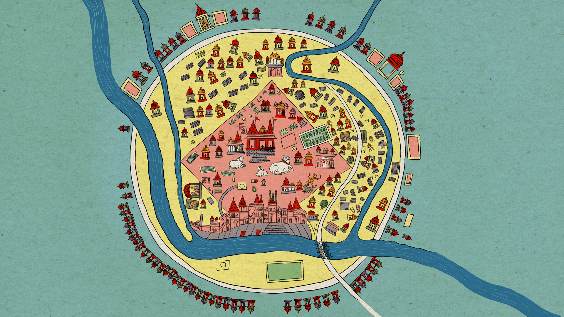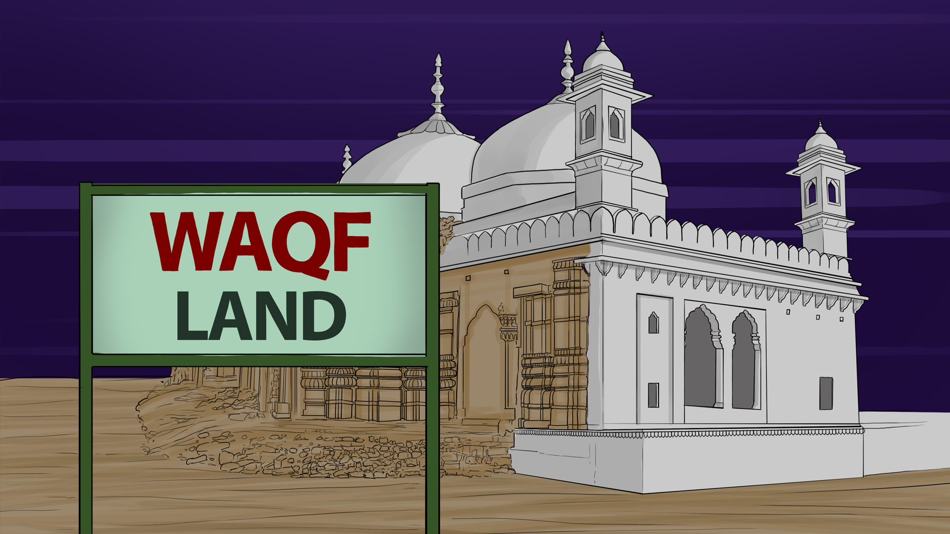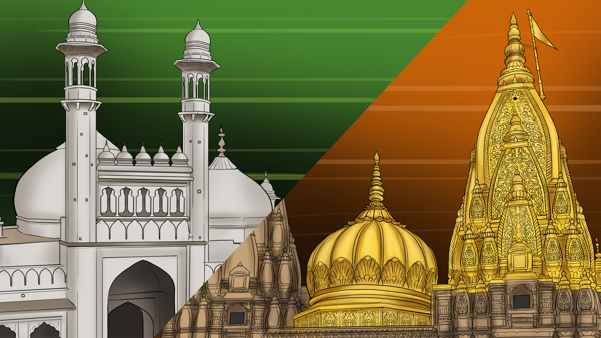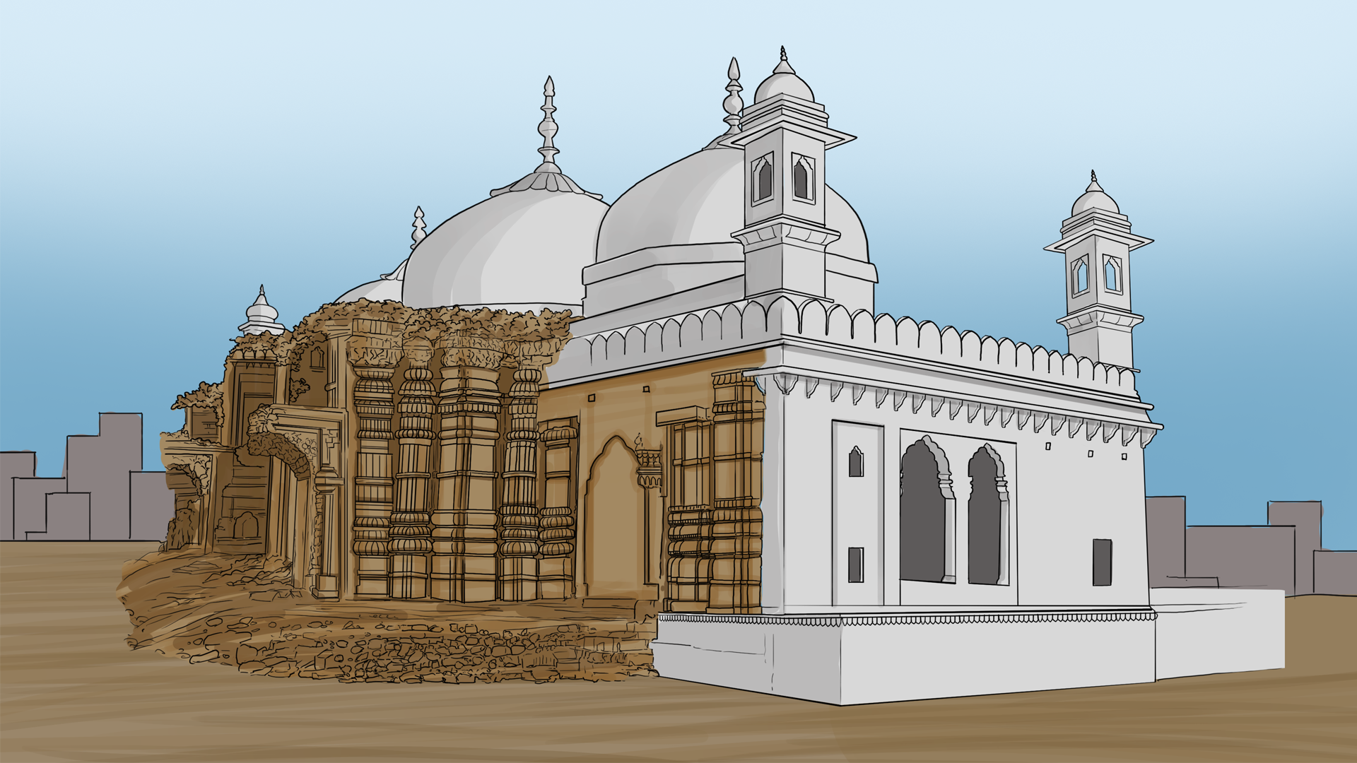 चित्रों में मस्जिद के पीछे मंदिर दर्शाया गया
