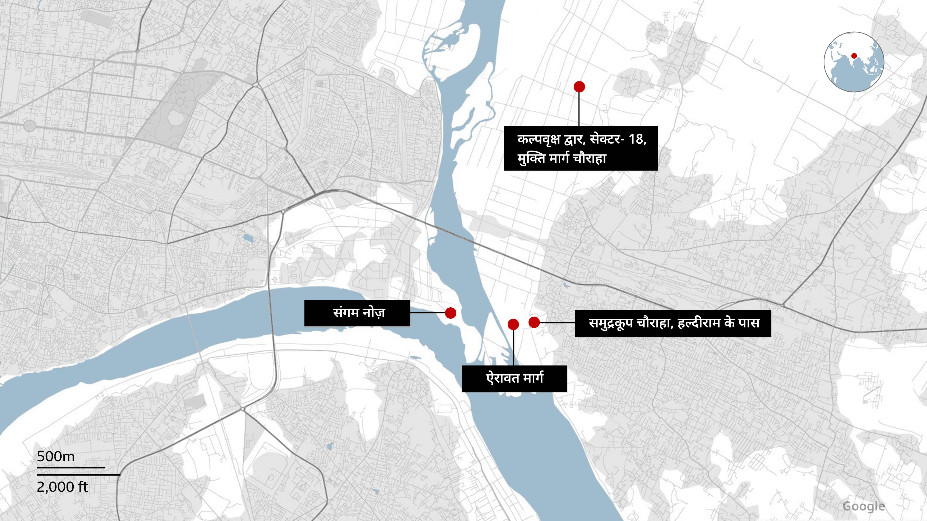 बीबीसी ने अपनी पड़ताल में पाया कि कुंभ मेला क्षेत्र में भगदड़ की चार जानलेवा घटनाएं हुई थीं- संगम नोज, समुद्रकूप चौराहे के पास हल्दीराम, एरावत मार्ग और सेक्टर 18 में कल्पवृक्ष द्वार के पास मुक्ति मार्ग चौराहा.