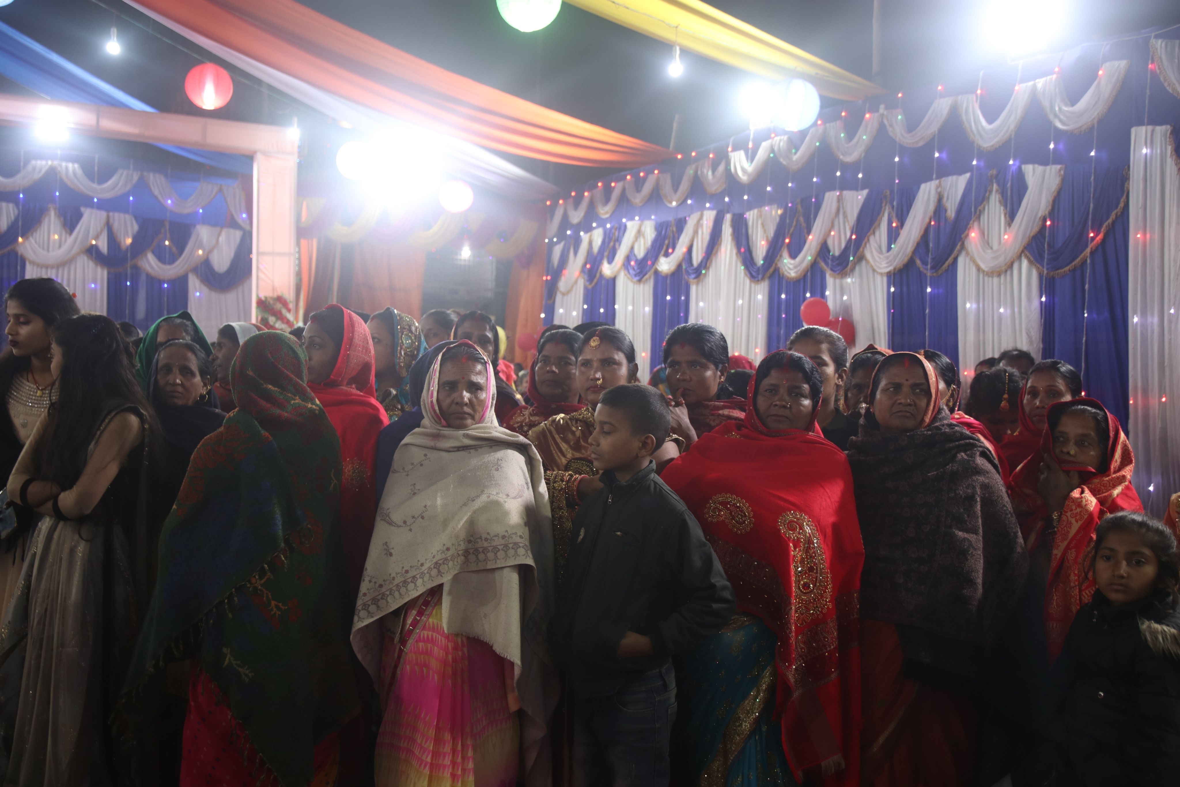 द्वारपूजा के लिए दूल्हा बैठ गया है. गाँव की महिलाएँ गीत गा रही हैं. दूसरी ओर गाँव के पुरुष खाने पर टूट पड़े हैं.