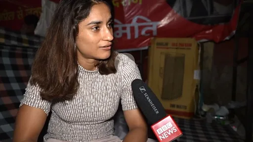 विनेश फोगाट ने कहा, "आप अंदर जाकर देख लेना, पानी भरा हुआ है, सोने की जगह नहीं है, हमारे पास. किसी के भी पास. हमने सोचा कि फट्टे (बेड) मंगाकर सो जाएंगे. फट्टे लेकर आने लगे तो धर्मेंद्र (पुलिसकर्मी) जो भी है, ख़ुद अकेला धक्के मारने लगा हमें, महिला पुलिसकर्मी नहीं थी, वो ख़ुद धक्के मारने लग गया हमें."
