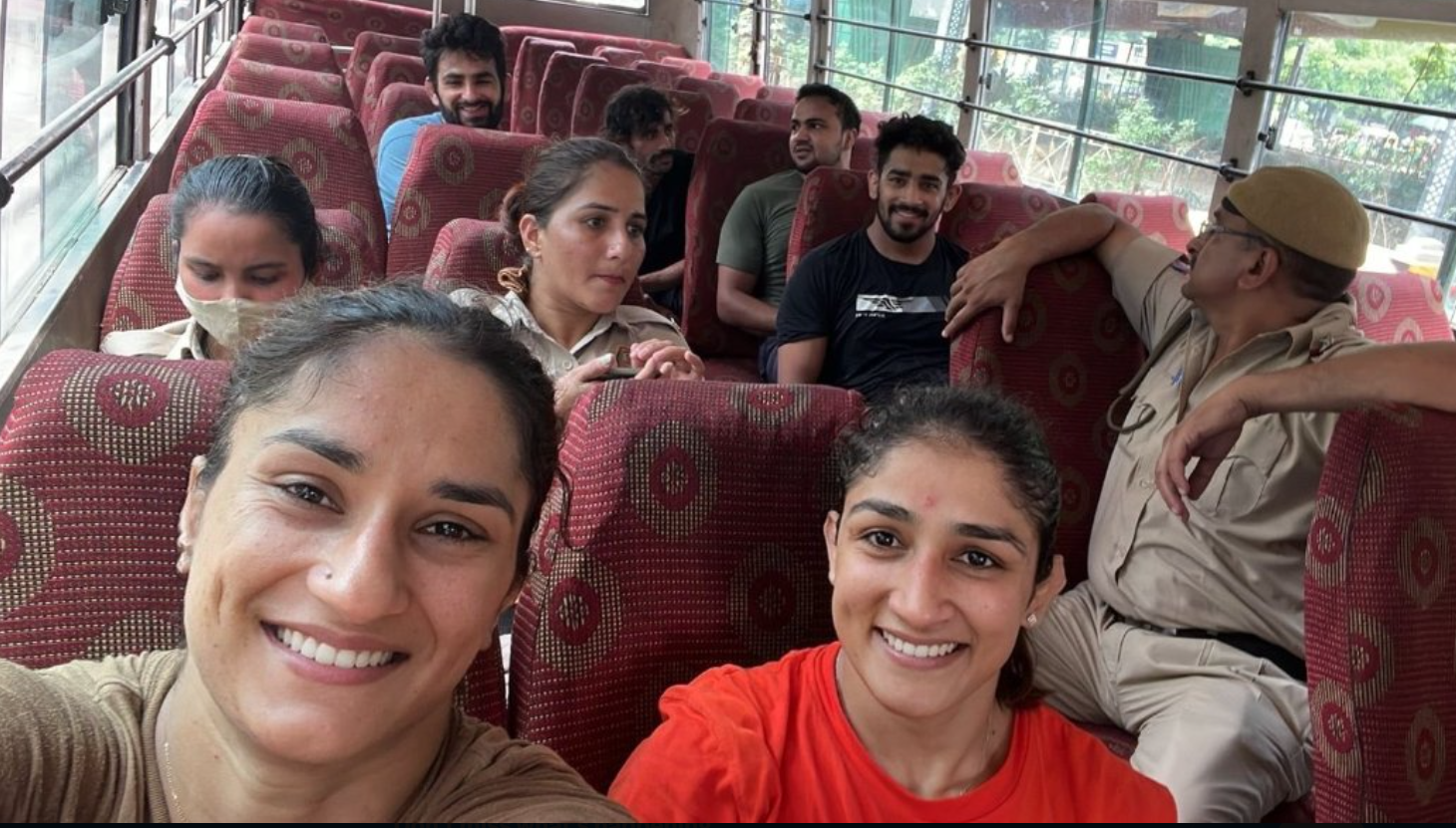 इस सेल्फ़ी में विनेश और संगीता फ़ोगाट पुलिस बस में बैठे नज़र आते हैं. उनके साथ तीन पुलिस वाले और चार अन्य लोग भी बैठे दिखते हैं.